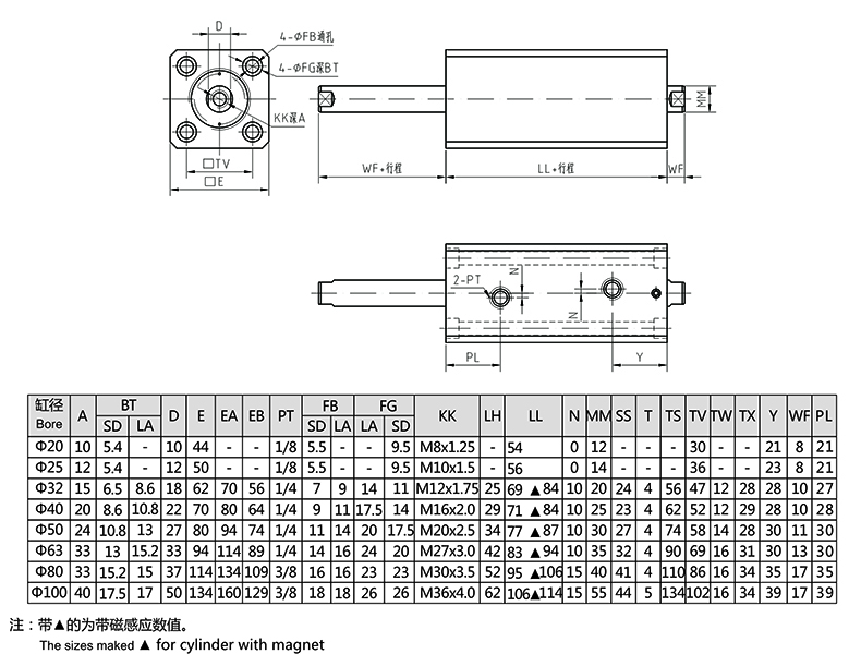薄型油缸SD型軸向安裝(雙軸)外形安裝尺寸圖
