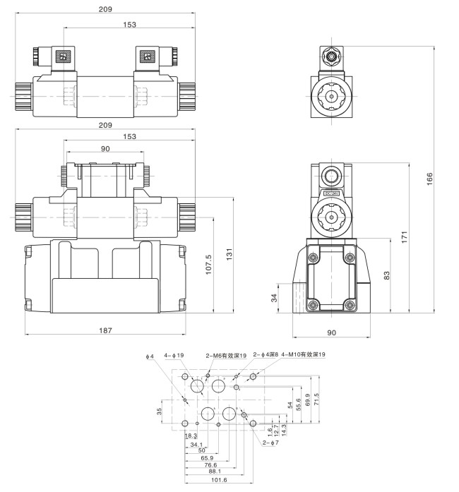 5、本系列電液換向閥,必須與電磁閥配合使用,單頭用02-2B2,雙頭用02-3C4。