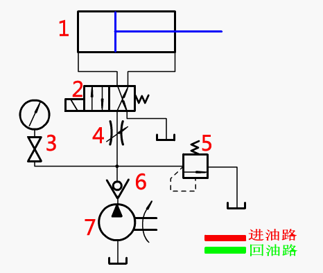油路說明:在進油管路上設置節(jié)流閥,控制液壓油流量,進而控制活塞桿移動速度
