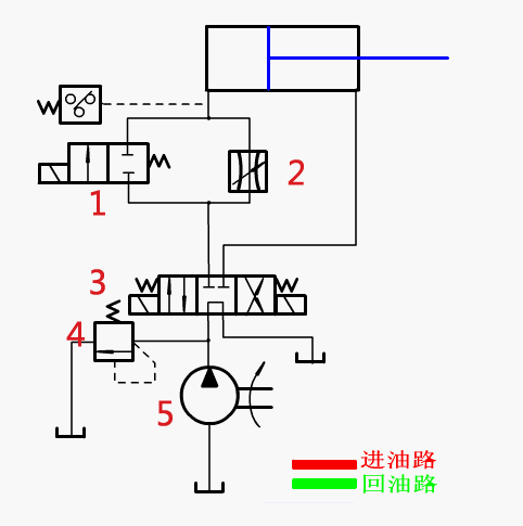 油路說明:液壓油在進油管路上從1通過,活塞桿快速移動,從2通過時,活塞桿慢速移動,工進時速度減慢。