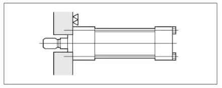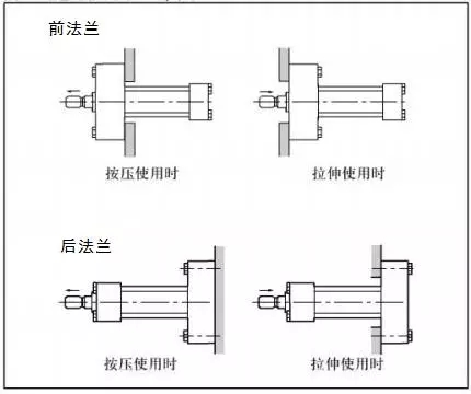 (1)法蘭安裝適合于液壓缸工作過程中固定式安裝,其作用力與支承中心處于同一軸線的工況;其安裝方式選擇位置有端部、中部或尾部三種,如何選擇取決作用于負載的主要作用力對活塞桿造成壓縮(推)應力、還是拉伸(拉)應力,一般壓縮(推)應力采用尾部、中部法蘭安裝,拉伸(拉)應力采用端部、中部法蘭安裝,確定采用端部、中部或尾部法蘭安裝需同時結合系統(tǒng)總體結構設計要求和長行程壓縮(推)力工況的液壓缸彎曲穩(wěn)定性確定。